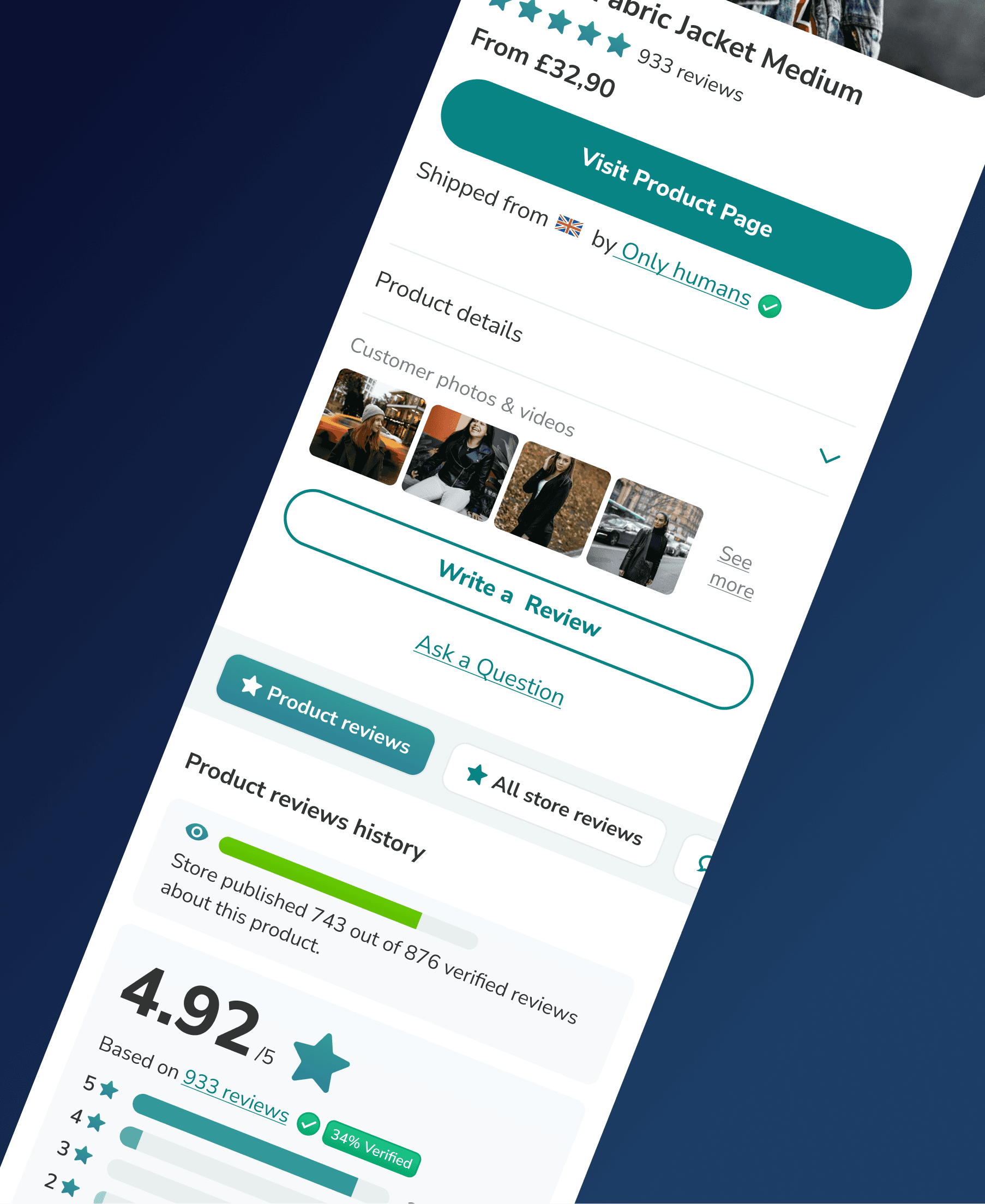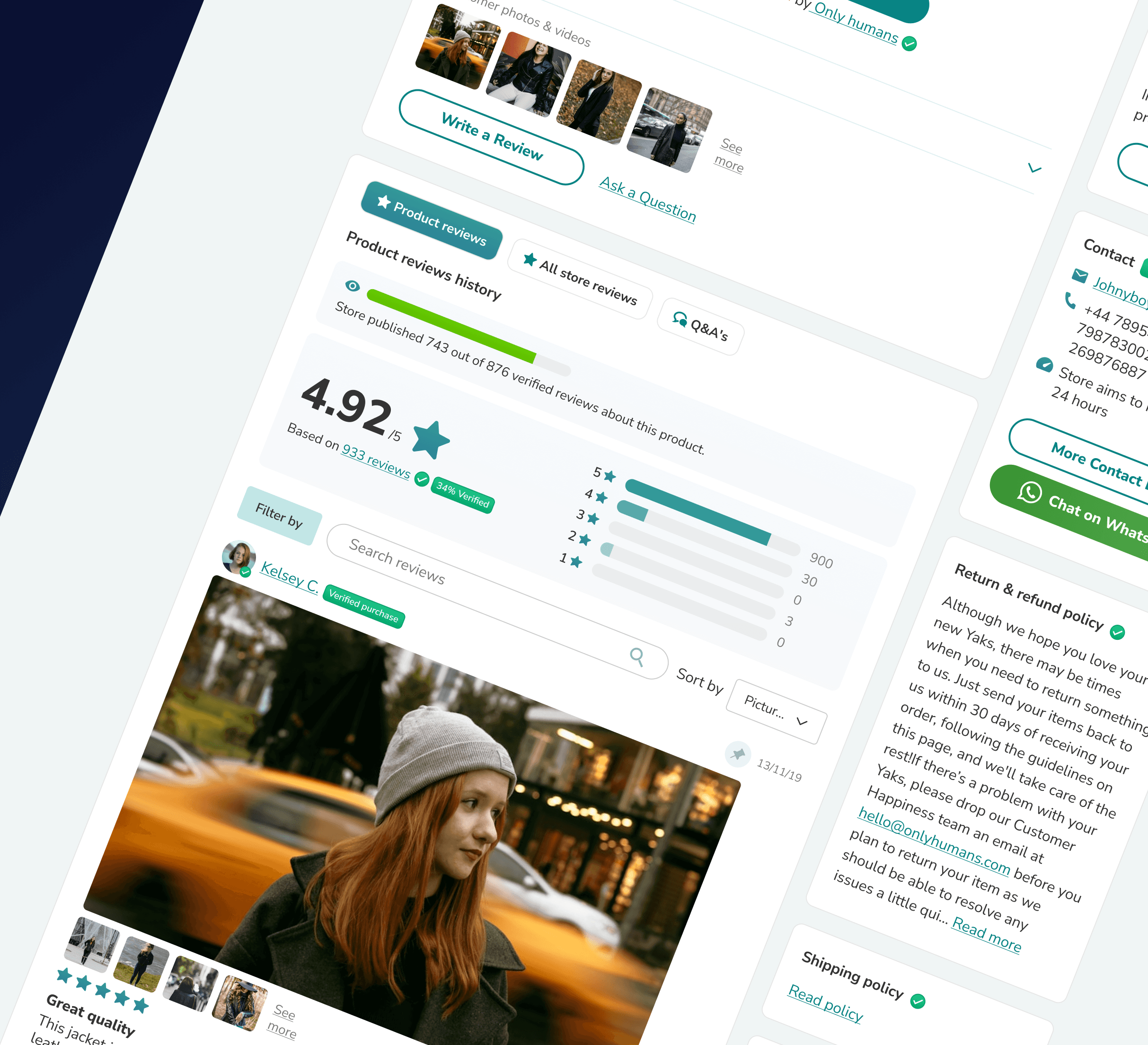We rebuilt the product page layout to create a more user-friendly and intuitive experience. The redesign prioritised the display of key review metrics, including an overall rating distribution, detailed information about the shop and reviews, and contacts. We also streamlined the design, ensuring that important information was highlighted and easy to access at a glance.